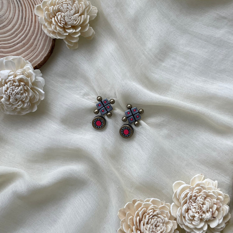 About the Product: Shika's handcrafted danglers are statement earrings that are great for making a powerful impressions. Terracotta 2 step dangling studs in amusing shades.