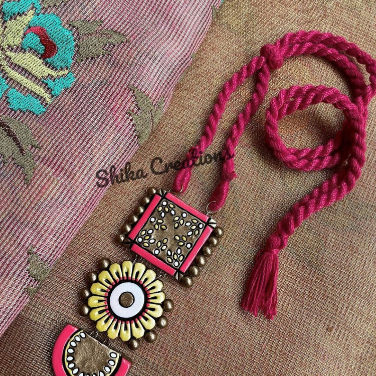 About the Product: Shika's regular wear sets are simple, goes with everything, and can be worn every day to get a sophisticated look. Terracotta 3 step pendant with dangler studs in pastel shades.The neckwear comes with an adjustable dori for the closure.