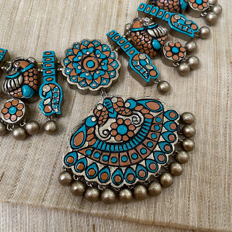 About the product - Signatures of Shika! Terracotta neckwear in stunning hues. It is paired with hanging jhumkas. The set comes with an adjustable thread for the closure.