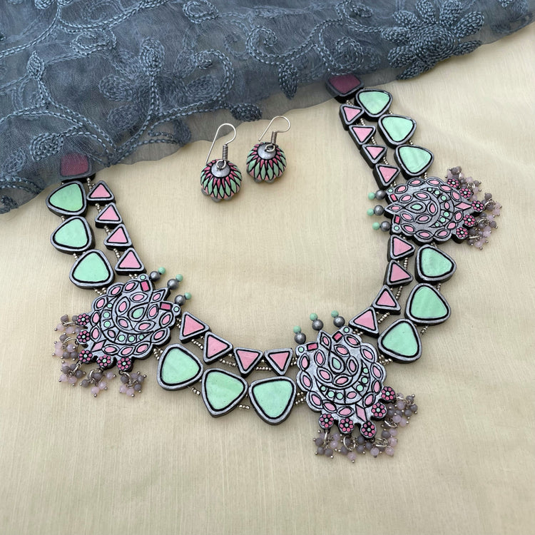 About the product - Signatures of Shika! Terracotta neckwear in maroon, gold and silver hues. It is paired with dangler jhumkas. The set comes with an adjustable thread for the closure.