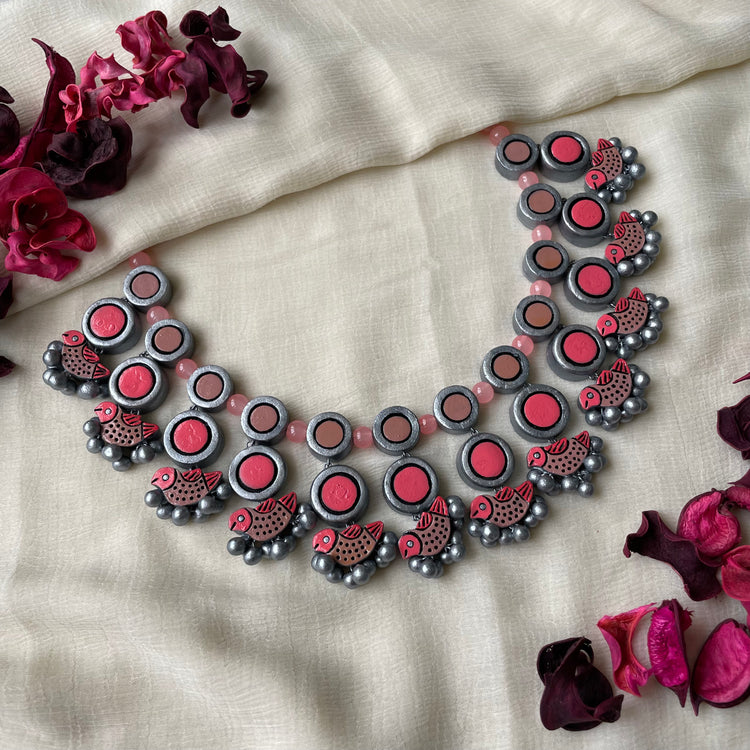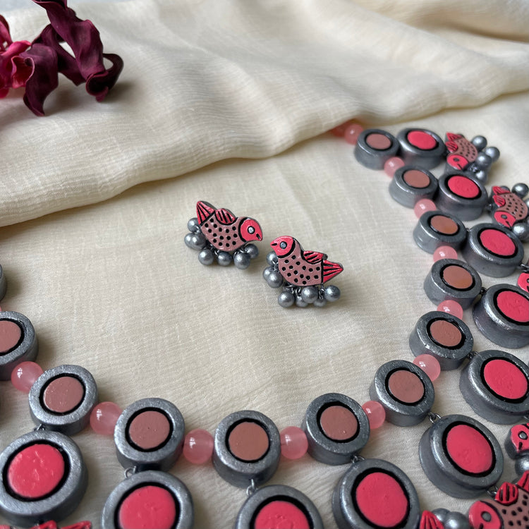 About the Product: This delicate piece of Shika is handcrafted to perfection. Your every moment deserves an elegance and we tune in. Terracotta birds neckwear with studs in stunning pink hues. The neckwear comes with an adjustable dori for the closure.