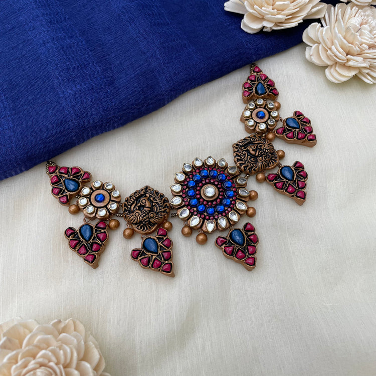 About the product - Signatures of Shika! Terracotta neckwear in stunning hues with kundhan stone embellishments . It is paired with jhumkas and danglers. The set comes with an adjustable thread for the closure.