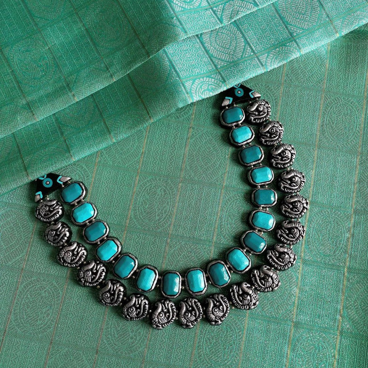 About the Product:This delicate piece of Shika is handcrafted to perfection. Your every moment deserves an elegance and we tune in. Terracotta two layered neckwear with studs in rustic shades. The neckwear comes with adjustable dori for the closure.