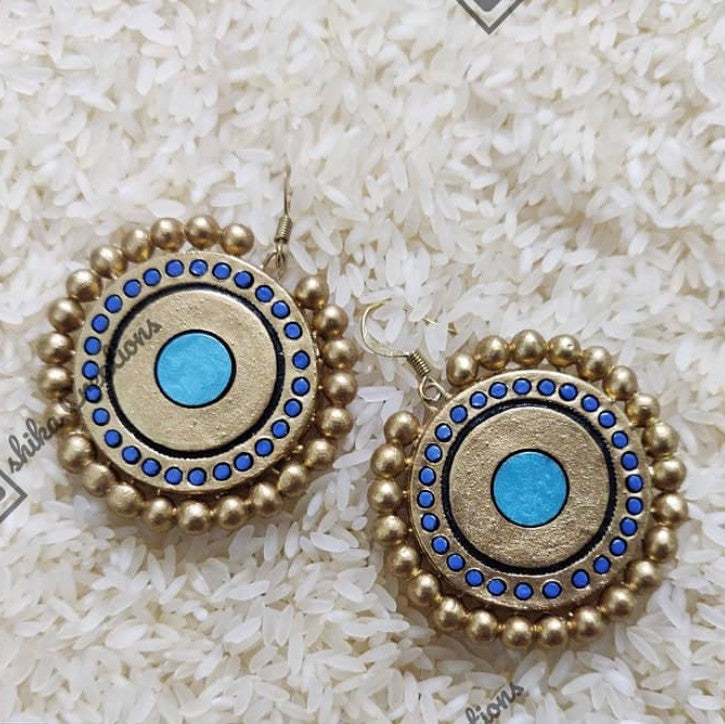 About the Product: Shika's handcrafted chand balis are timeless and look chic despite ever-changing fashions. Terracotta chand bali earings with lollipop beads in blue and gold hues.