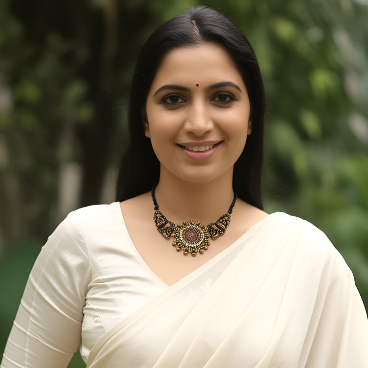About the product - Signatures of Shika! Terracotta neckwear in stunning hues with kundhan stone embellishments . It is paired with studs. The set comes with an adjustable thread for the closure.