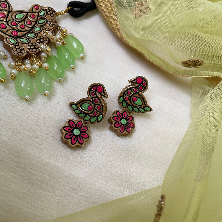 About the Product: Shika handcrafts each and every piece with love and perfection. Utmost care is taken in carving each terracotta piece. Terracotta choker with danglers in vibrant shades. The neckwear comes with an adjustable dori for the closure.