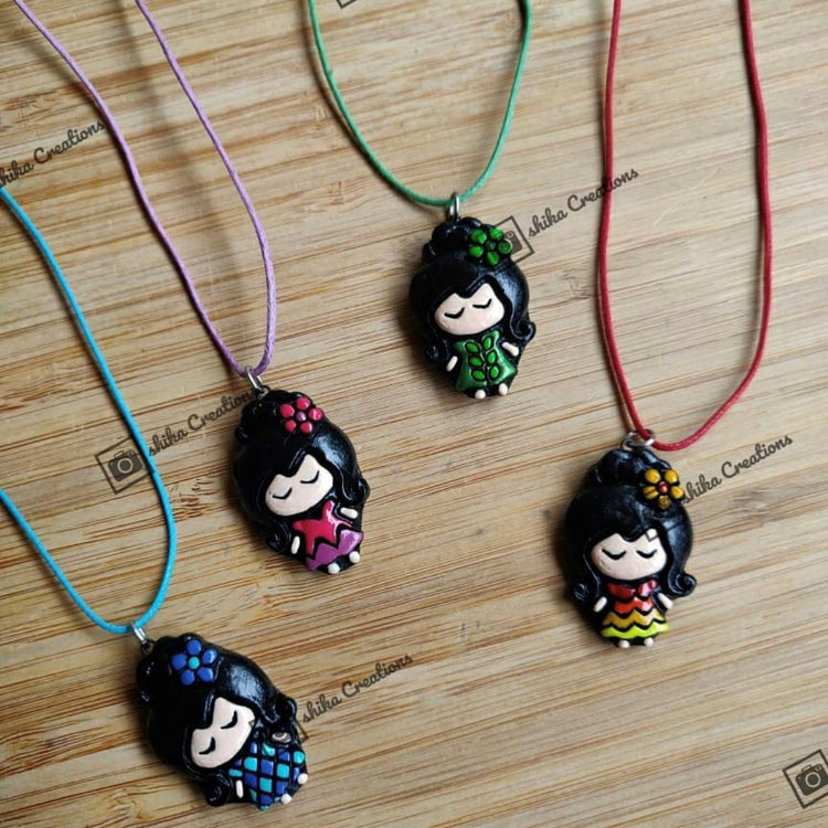 About the Product: Shika brings out utmost perfection even in the little ones. Terracotta tiny doll pendants in glaring shades. This kids wear pendant comes with an adjustable nylon thread.