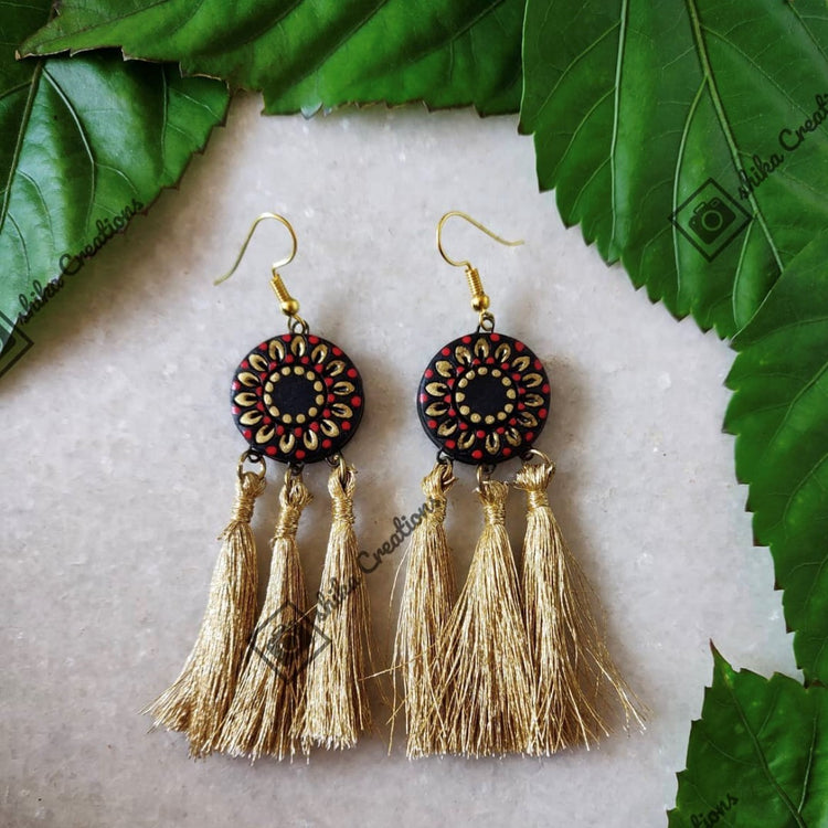 About the Product: Shika's handcrafted danglers are statement earrings that are great for making a powerful impressions. Terracotta danglers with tassels in gold and red hues.
