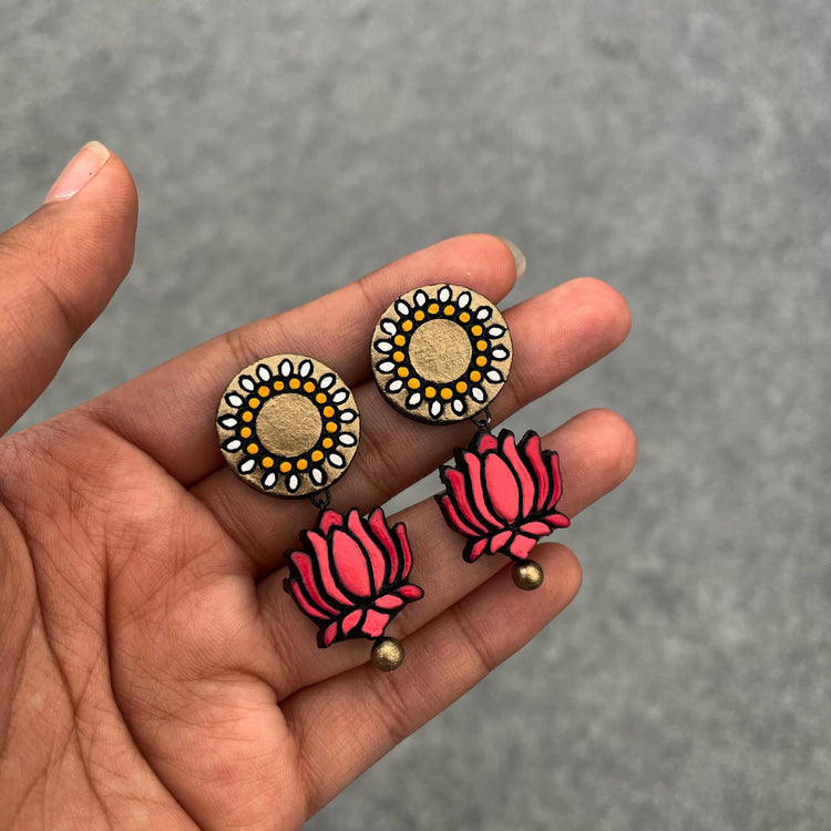 About the Product: Shika's handcrafted danglers are statement earrings that are great for making a powerful impressions. Terracotta 2 step lotus danglers in shades of pink.