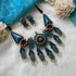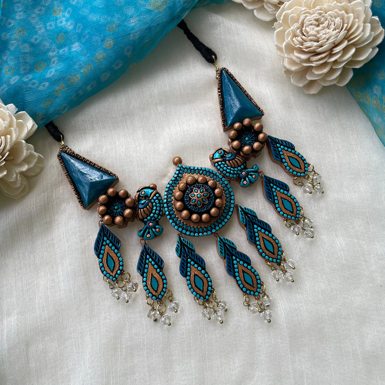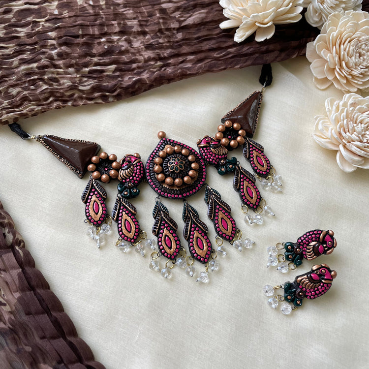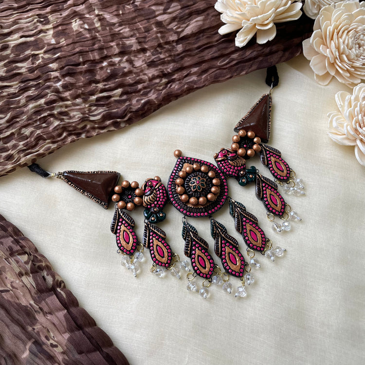 About the product - Signatures of Shika! Terracotta neckwear/ choker in stunning hues with dangling stones. It is paired with peacock studs with dangling stones. The set comes with an adjustable thread for the closure.