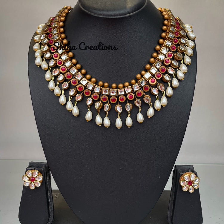 About the Product: Shika blended terracotta with kemp stones to get a brilliant new look for your outfit. Kemp stones are semi-precious stones and they dazzle in bright ambiance. What makes this more special is that this is completely handcrafted. Terracotta neckwear and studs with kemp stone and kundhan stones embellishments with dangling pearls. The neckwear comes with an adjustable dori for the closure.