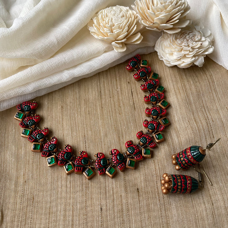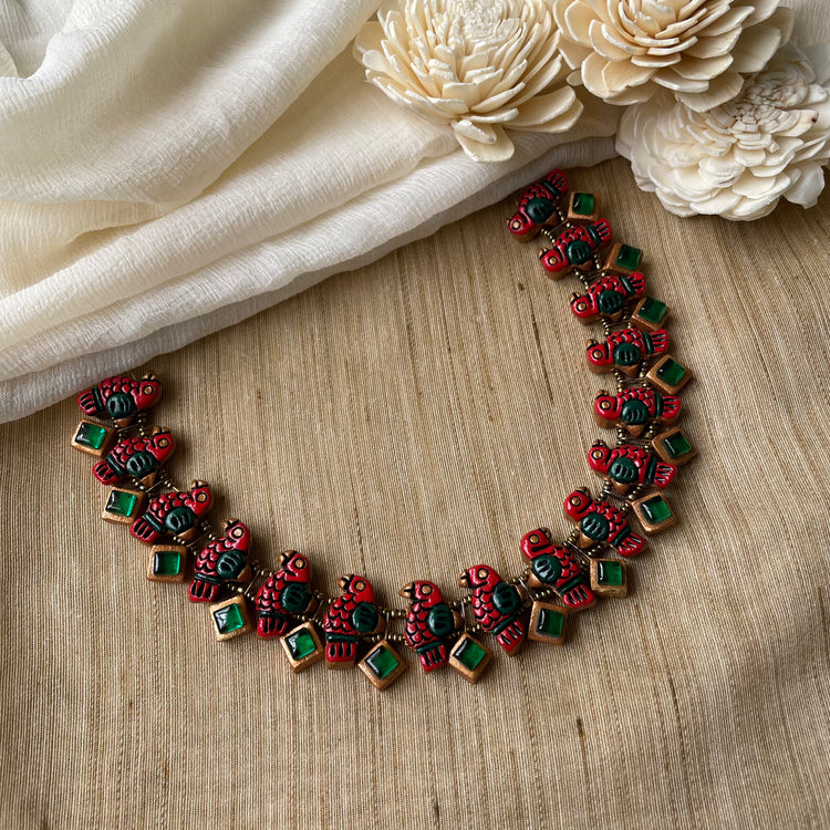 About the product: Shika blended terracotta with kemp stones to get a brilliant new look for your outfit. Kemp stones are semi-precious stones and they dazzle in bright ambiance. What makes this more special is that this is completely handcrafted. Terracotta neckwear with kemp stone embellishments and jhumkas. The neckwear comes with adjustable chain for the closure.