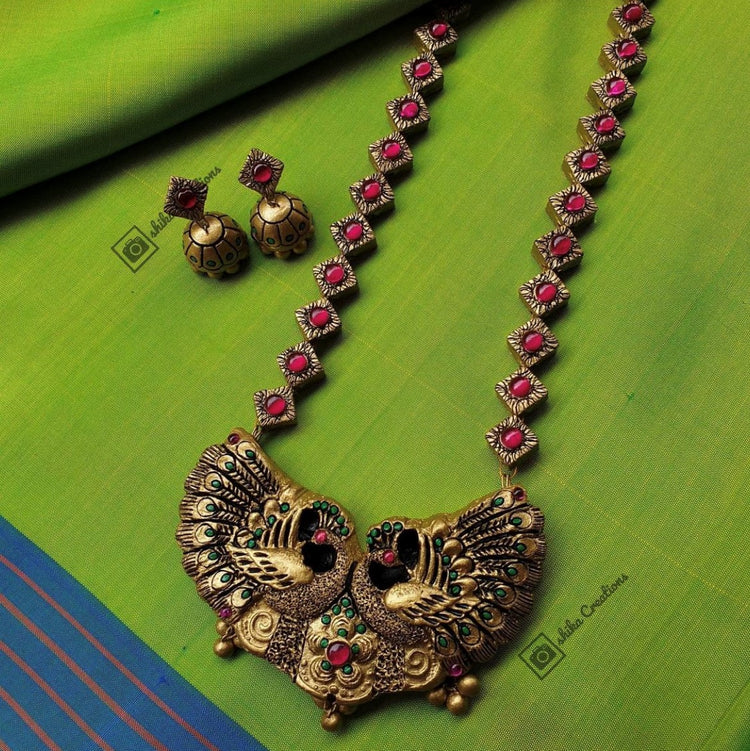 About the Product: Shika blended terracotta with kemp stones to get a brilliant new look for your outfit. Kemp stones are semi-precious stones and they dazzle in bright ambiance. What makes this more special is that this is completely handcrafted. Terracotta neckwear and jhumkas with kemp stone embellishments. The neckwear comes with an adjustable chain for the closure.