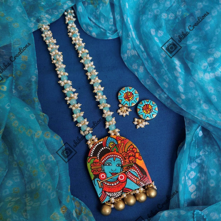 About the Product: This delicate piece of Shika is handcrafted to perfection. Your every moment deserves an elegance and we tune in. Terracotta Krishna mural neckwear with studs. The neckwear comes with an adjustable dori for the closure.