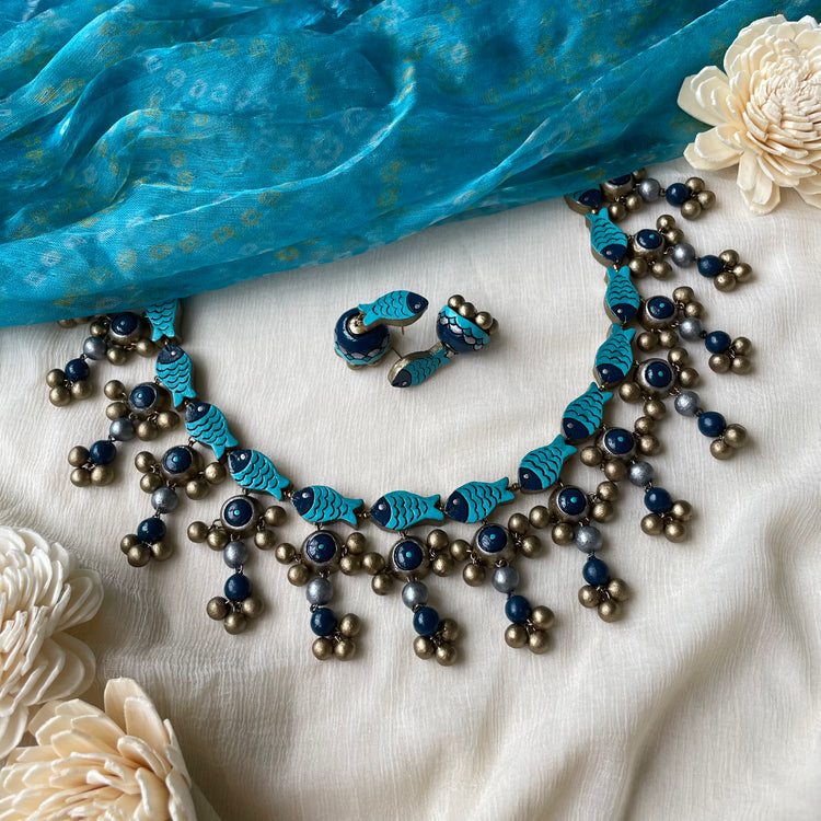 About the Product: This delicate piece of Shika is handcrafted to perfection. Your every moment deserves an elegance and we tune in. Terracotta fish neckwear with studs in stunning blue hues. The neckwear comes with an adjustable dori for the closure.