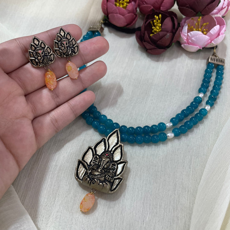 About the product: Shika's regular wear sets are simple, goes with everything, and can be worn every day to get a sophisticated look. Terracotta Ganesha pendant with studs in dusky orange and pthalo turqoise hues. The neckwear comes with an adjustable dori for the closure.