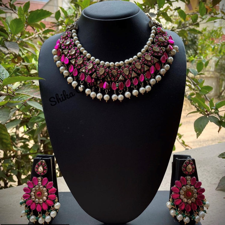 About the Product: Shika blended terracotta with kundhans to get a new stunning look for your outfit. What makes this more special is that this is completely handcrafted. Terracotta choker and chand bali earings with kundhan stone embellishments and dangling pearls. The neckwear comes with an adjustable chain for the closure.