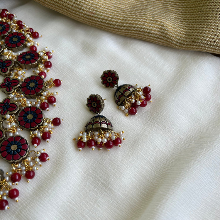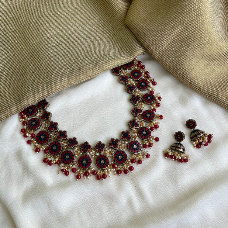 About the Product: This delicate piece of Shika is handcrafted to perfection.Your every moment deserves an elegance and we tune in. Terracotta neckwear with danglers in red, Prussian blue and gold shades.The neckwear comes with adjustable thread for the closure.