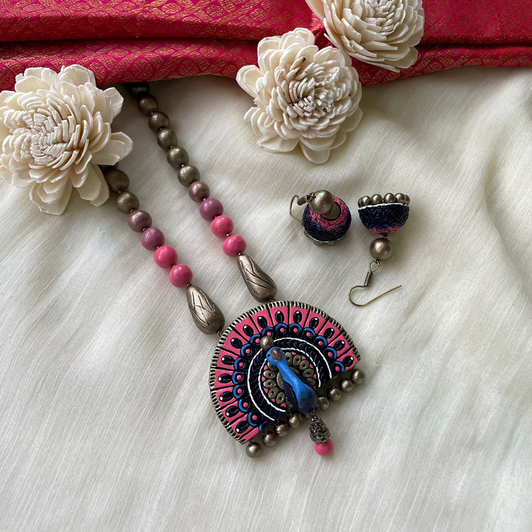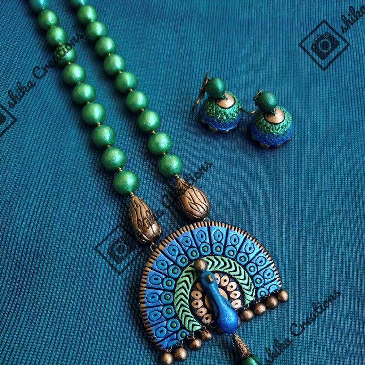 About the Product: This delicate piece of Shika is handcrafted to perfection. Your every moment deserves an elegance and we tune in. Terracotta peacock neckwear with dangling jhumkas. The neckwear comes with an adjustable dori for the closure..