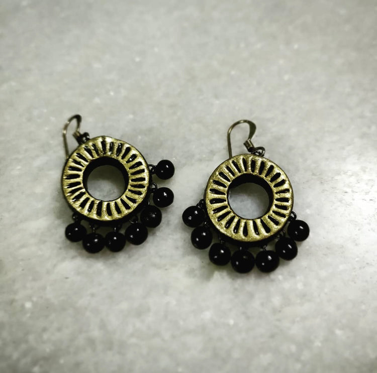 About the Product: Shika's handcrafted chand balis are timeless and look chic despite ever-changing fashions. Terracotta chand bali earings with dangling beads in gold and black hues.