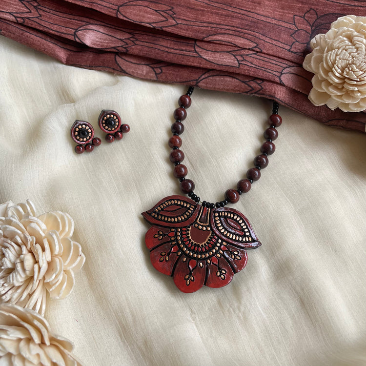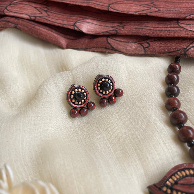 About the Product: Shika's regular wear sets are simple, goes with everything, and can be worn every day to get a sophisticated look. Terracotta pendant with studs in black and mocha shades. The neckwear comes with an adjustable dori for the closure.