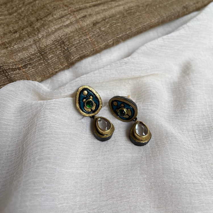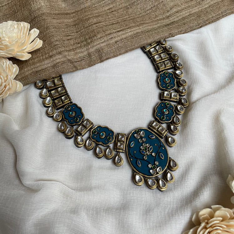About the Product: This delicate piece of Shika is handcrafted to perfection.Your every moment deserves an elegance and we tune in. Terracotta neckwear with studs in the endless gold shades with kundhan stone embellishments.The neckwear comes with adjustable thread for the closure.