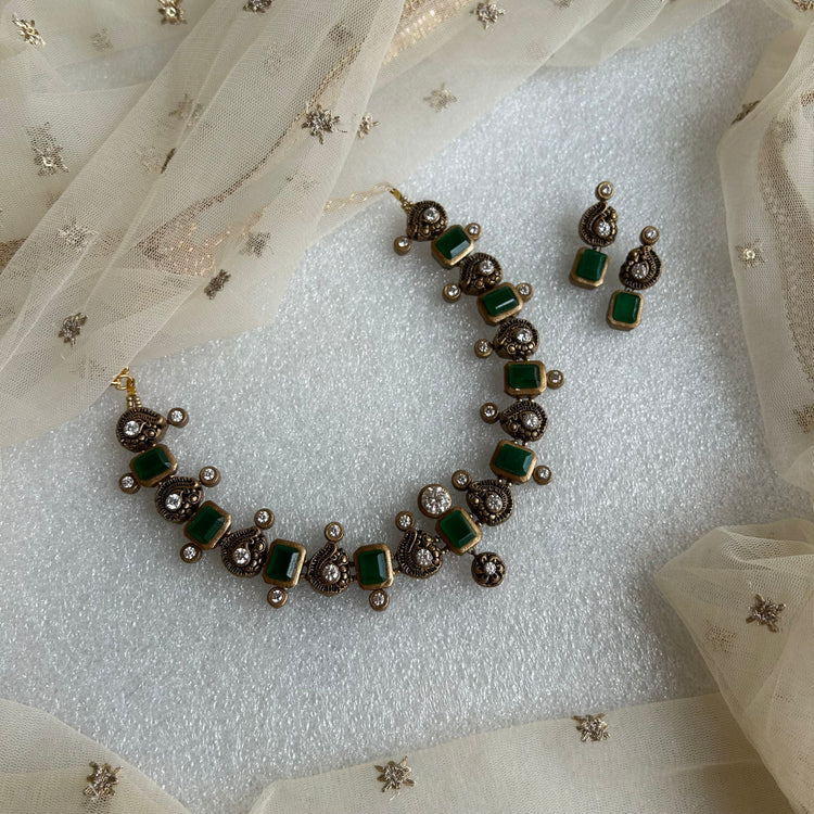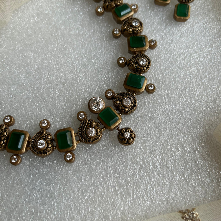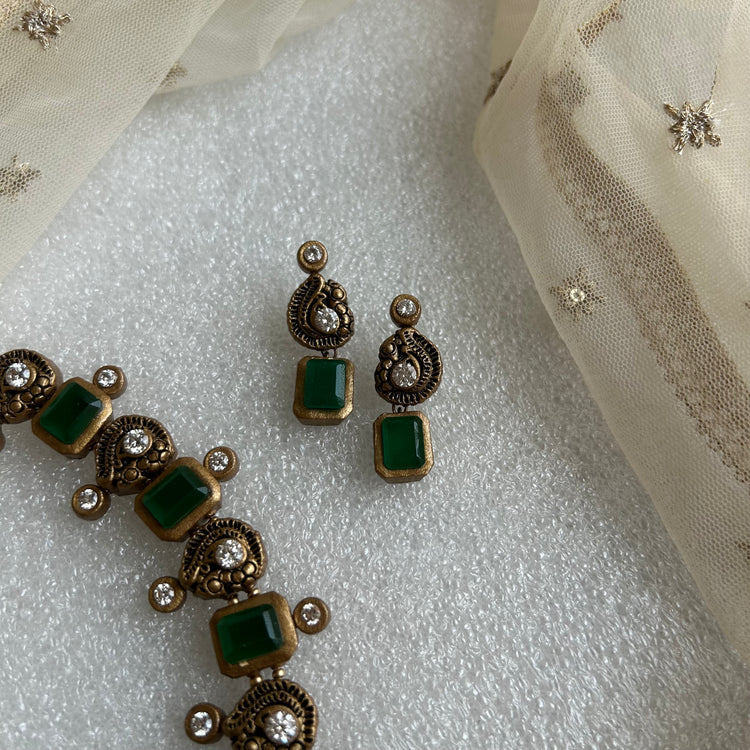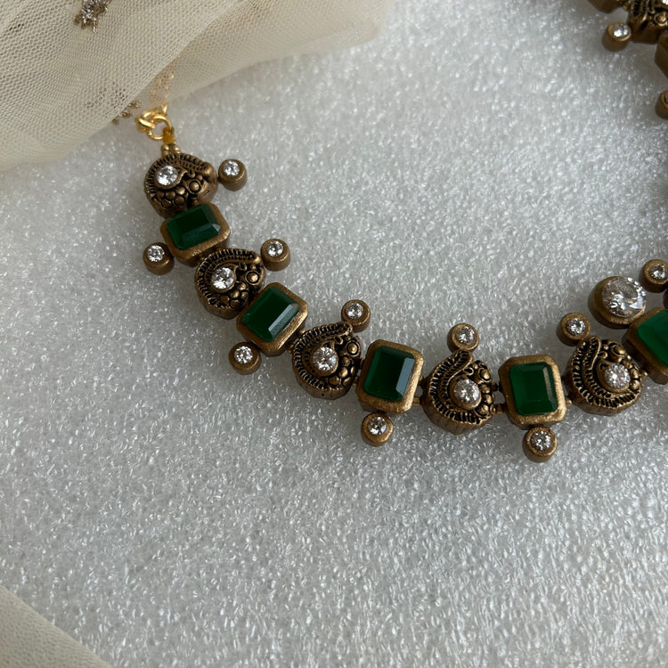 About the product: Shika blended terracotta with kemp stones to get a brilliant new look for your outfit. Kemp stones are semi-precious stones and they dazzle in bright ambiance. What makes this more special is that this is completely handcrafted. Terracotta neckwear with Moissanite and kemp stone embellishments with dangling studs. The neckwear comes with adjustable chain for the closure.