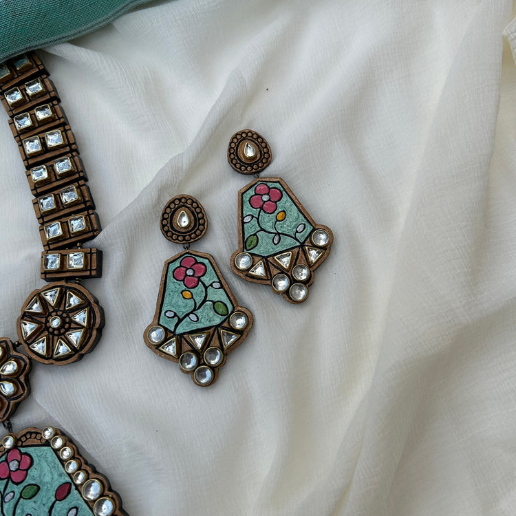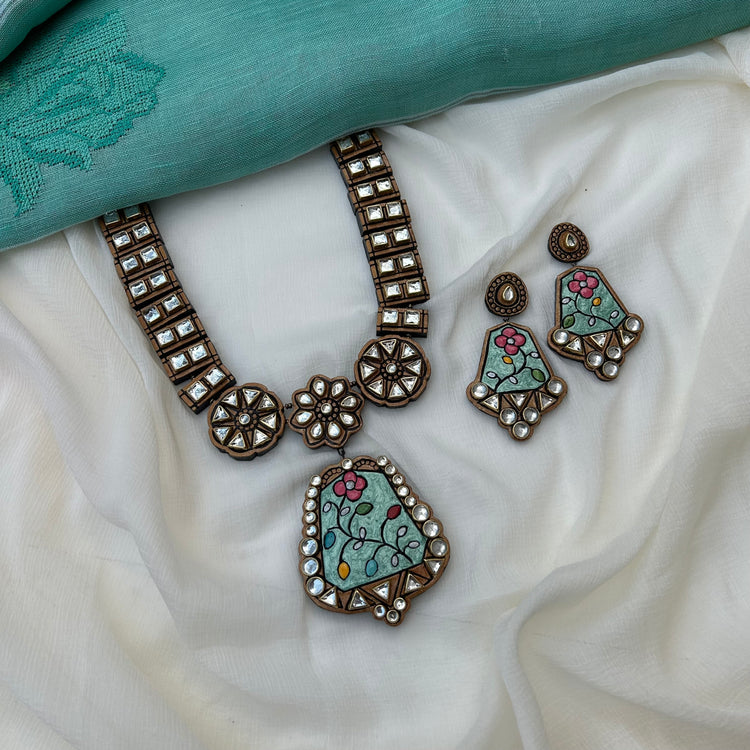 About the Product: This delicate piece of Shika is handcrafted to perfection.Your every moment deserves an elegance and we tune in. Terracotta neckwear with danglers in a golden wrap with Kundhan stones embellishments.The neckwear comes with adjustable thread for the closure.