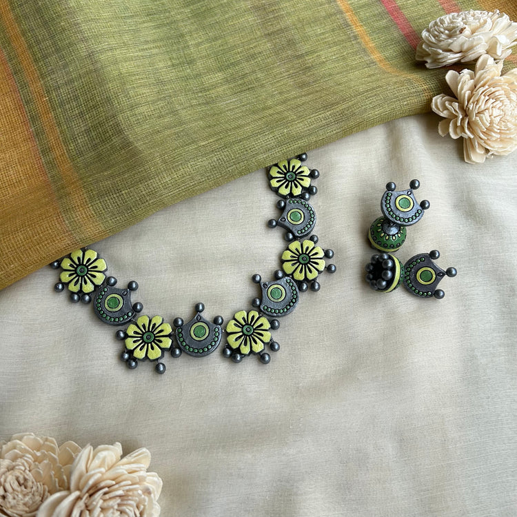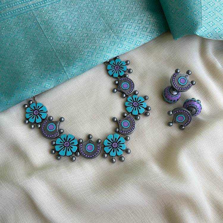 About the product - Signatures of Shika! Terracotta neckwear in pastel hues. It is paired with jhumkas. The set comes with an adjustable thread for the closure.