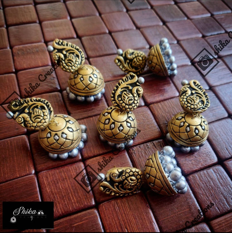 About the Product: You must not be afraid to sparkle a little brighter, darling! Shika handcrafts the terracotta jhumkas with care and perfection. Terracotta peacock jhumkas in silver and gold hues and it comes in a set of 3