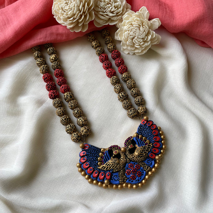 About the Product: This delicate piece of Shika is handcrafted to perfection. Your every moment deserves an elegance and we tune in. Terracotta peacock neckwear with jhumkas wrapped in gold with stunning blues and peaches. The neckwear comes with an adjustable dori for the closure.
