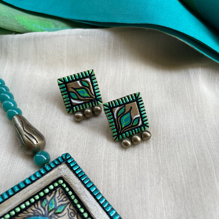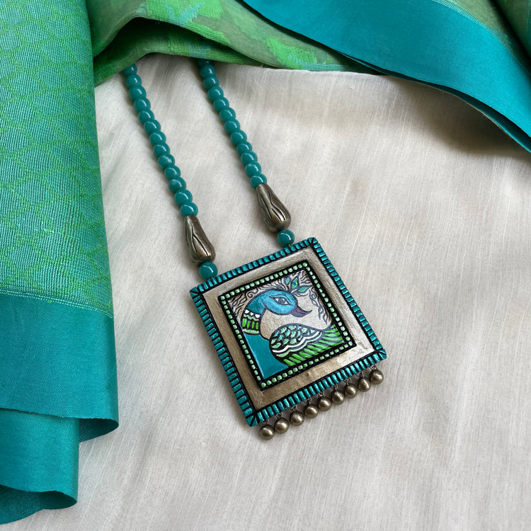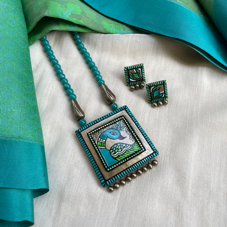 About the Product: Shika's regular wear sets are simple, goes with everything, and can be worn every day to get a sophisticated look. Terracotta peacock pendant with studs in antique and turqoise shades. The neckwear comes with an adjustable dori for the closure.