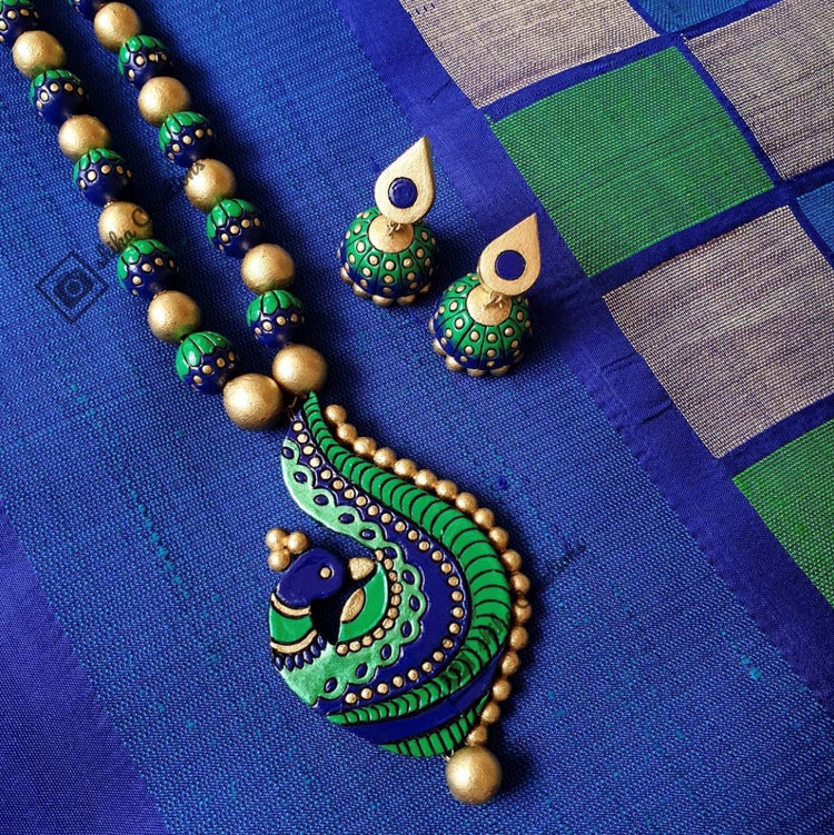 About the Product: This delicate piece of Shika is handcrafted to perfection.Your every moment deserves an elegance and we tune in. Terracotta peacock neckwear with jhumkas in the green and blue shades. the neckwear comes with adjustble dori for the closure.