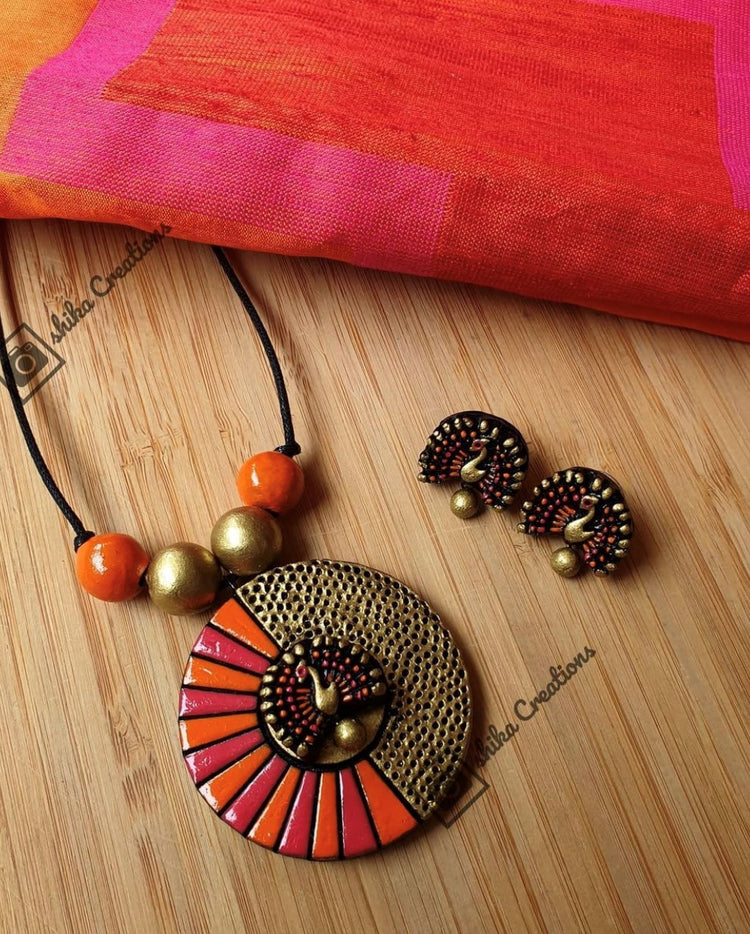 About the Product: Shika's regular wear sets are simple, goes with everything, and can be worn every day to get a sophisticated look. Terracotta pendant with studs in orange-pink shades.The neckwear comes with an adjustable dori for the closure.