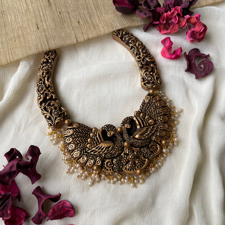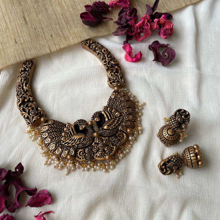 About the Product: This delicate piece of Shika is handcrafted to perfection. Your every moment deserves an elegance and we tune in. Terracotta peacock neckwear with jhumkas wrapped in gold with dangling pearls. The neckwear comes with an adjustable dori for the closure.