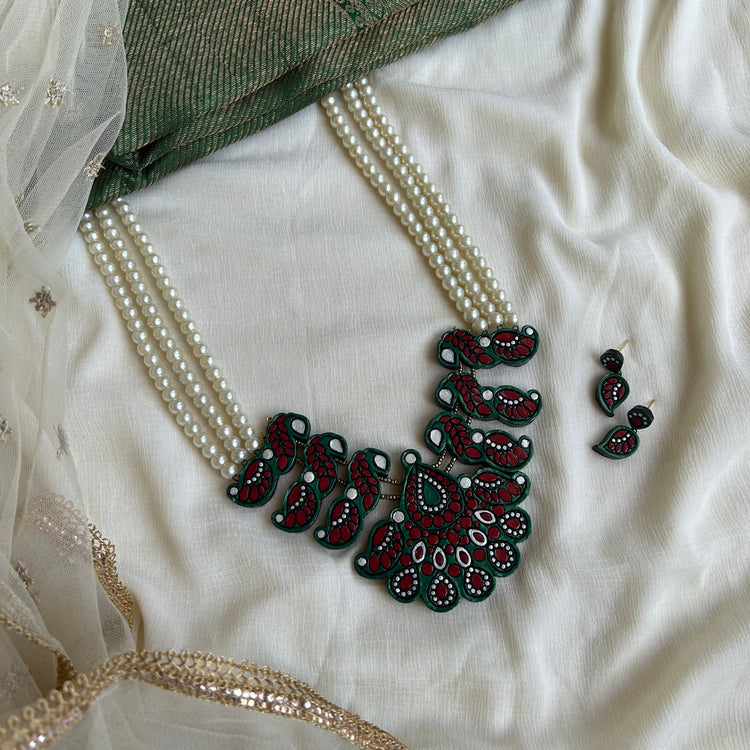 About the Product: This delicate piece of Shika is handcrafted to perfection.Your every moment deserves an elegance and we tune in. Terracotta neckwear with studs in red, green and pearl white shades.The neckwear comes with adjustable thread for the closure.