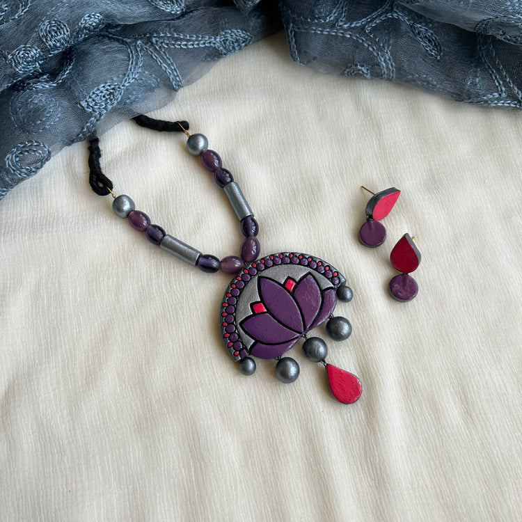 About the Product: Shika's regular wear sets are simple, goes with everything, and can be worn every day to get a sophisticated look. Terracotta pendant with studs in stunning purple and pink shades. The neckwear comes with an adjustable dori for the closure.