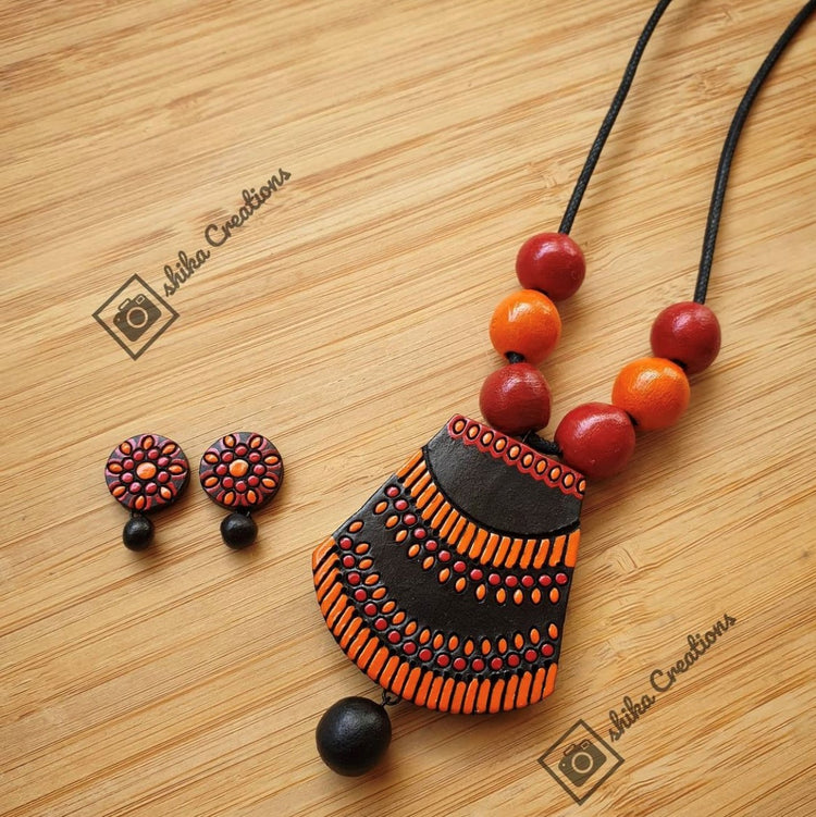 About the Product: Shika's regular wear sets are simple, goes with everything, and can be worn every day to get a sophisticated look. Terracotta pendant with studs in classic shades.The neckwear comes with an adjustable dori for the closure.