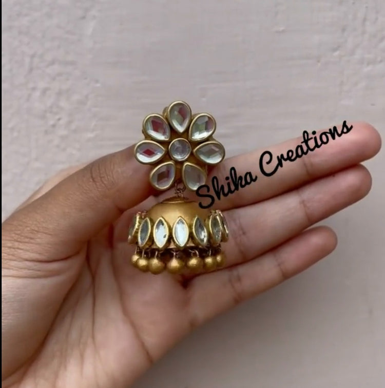 About the Product: You must not be afraid to sparkle a little brighter, darling! Shika handcrafts the terracotta jhumkas with care and perfection. Terracotta jhumkas with kundhan stone embellishments.