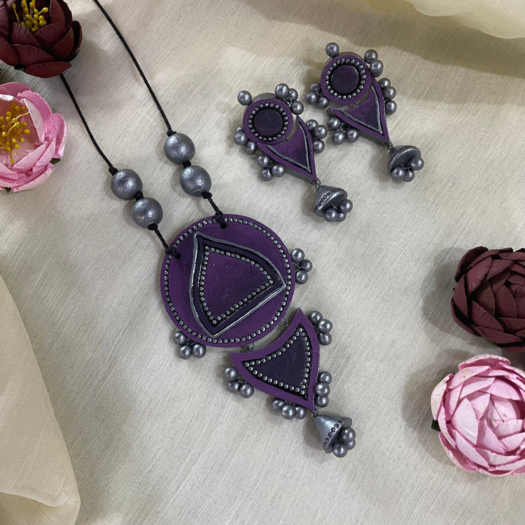 About the product: Shika's Regular Wear Sets Are Simple, Goes With Everything, And Can Be Worn Every Day To Get A Sophisticated Look. Terracotta Pendant With Danglers In Shades Of Purple. The Neckwear Comes With An Adjustable Dori For The Closure.