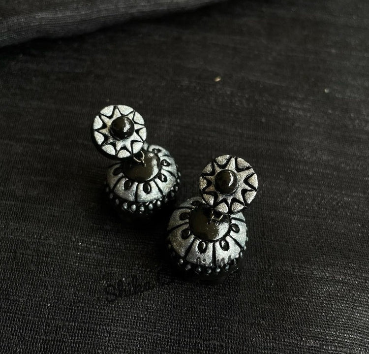 About the Product: You must not be afraid to sparkle a little brighter, darling! Shika handcrafts the terracotta jhumkas with care and perfection. Terracotta jhumkas painted with shimmering silver in a black base