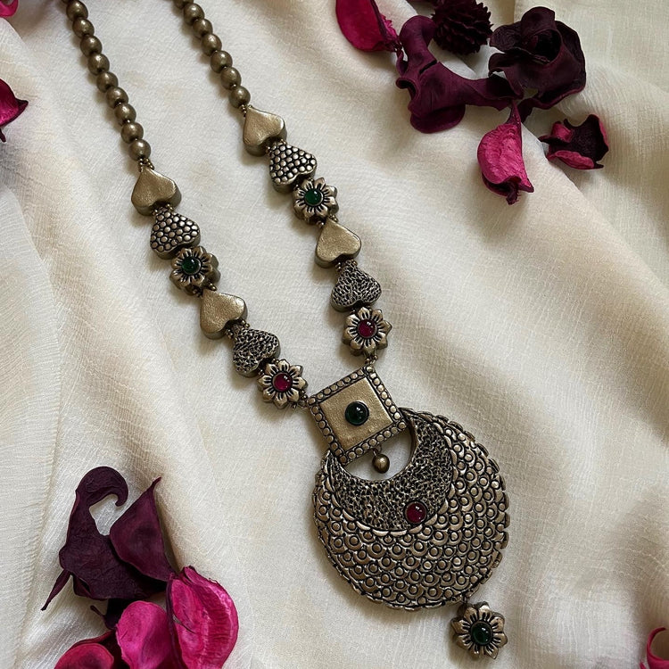 About the Product: Shika blended terracotta with kemp stones to get a brilliant new look for your outfit. Kemp stones are semi-precious stones and they dazzle in bright ambiance. What makes this more special is that this is completely handcrafted. Terracotta neckwear and jhumkas with kemp stone embellishments.The neckwear comes with adjustable dori for the closure.
