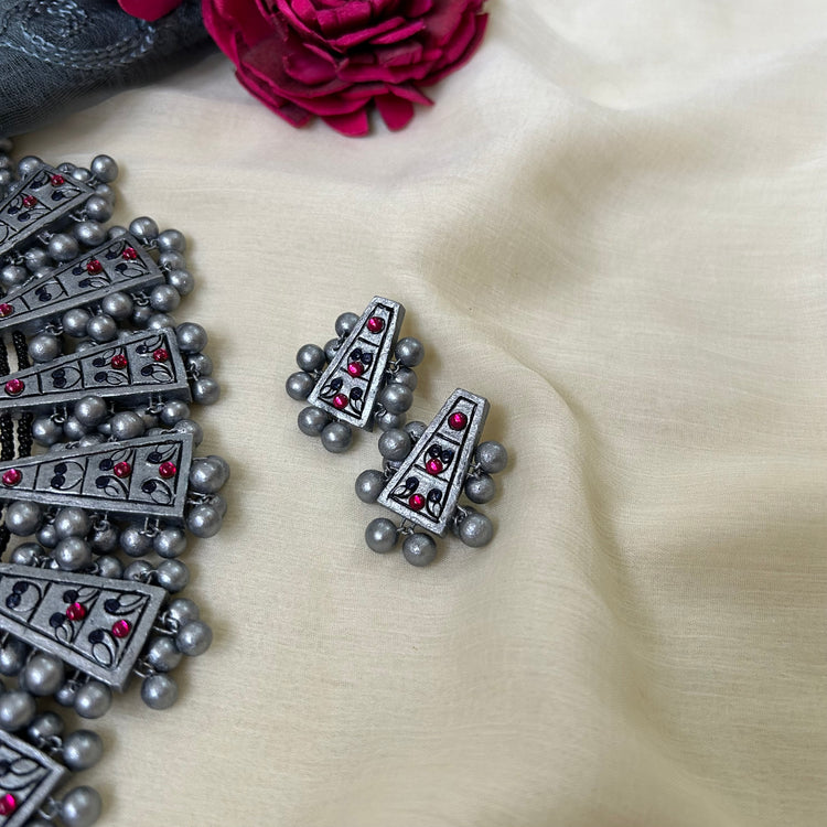 About the Product: This delicate piece of Shika is handcrafted to perfection.Your every moment deserves an elegance and we tune in. Terracotta neckwear with studs in the charming silver hues with kundhan stone embellishments.The neckwear comes with adjustable thread for the closure.