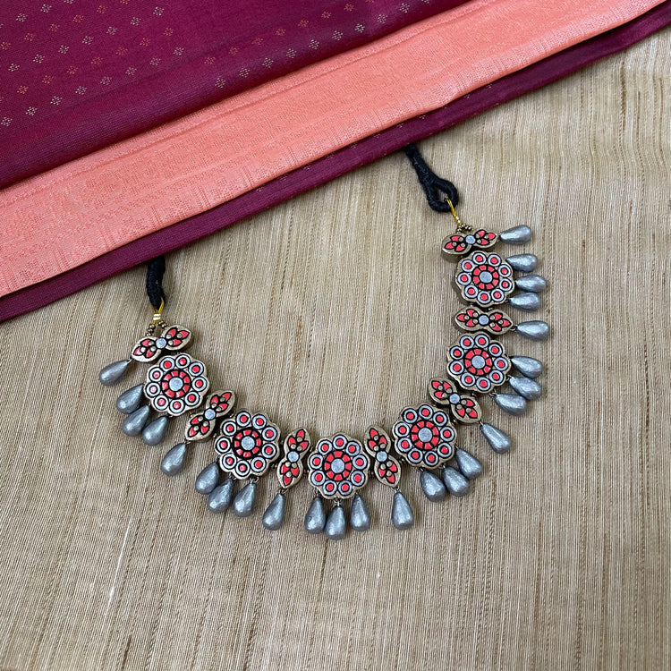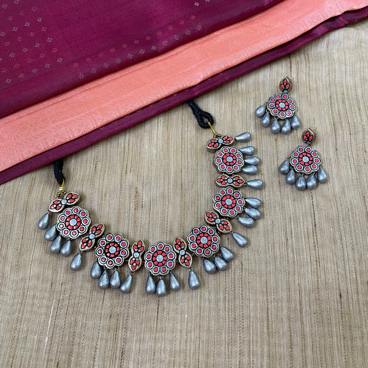 About the Product: This delicate piece of Shika is handcrafted to perfection.Your every moment deserves an elegance and we tune in. Terracotta neckwear and jhumkas in stunning shades. The neckwear comes with adjustble dori for the closure.