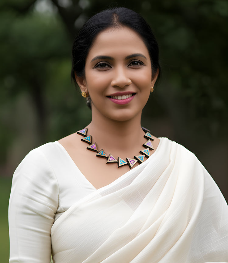 About the Product: This delicate piece of Shika is handcrafted to perfection.Your every moment deserves an elegance and we tune in. Terracotta neckwear with jhummus stunning silver, pink, blue and antique shades The neckwear comes with adjustable dori for the closure.