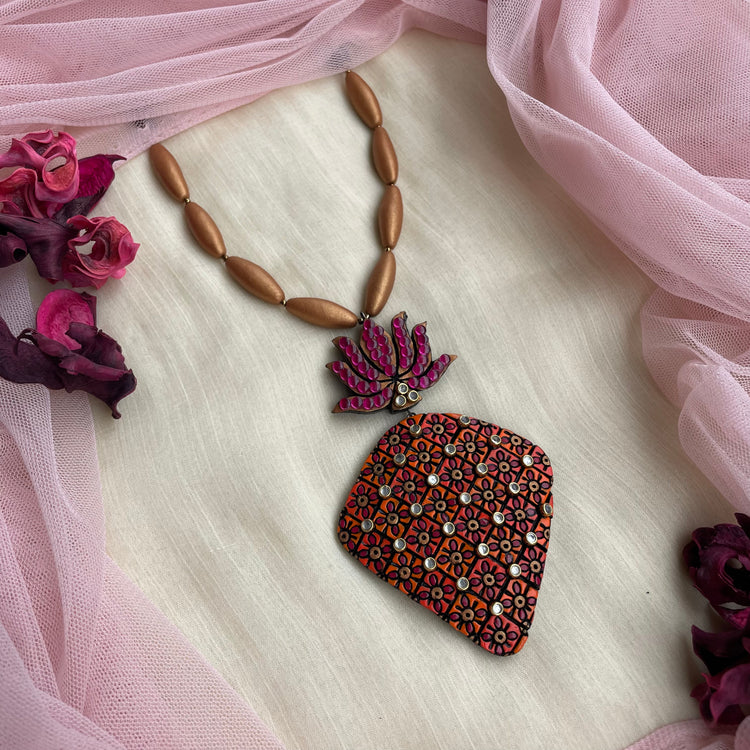 About the Product: Shika's regular wear sets are simple, goes with everything, and can be worn every day to get a sophisticated look. Terracotta daily wear simple pendant with jhumkas in beautiful orange and pink shades with kemp and kundhan stone embellishments. Kemp stones are semi precious stones. The neckwear comes with an adjustable dori for the closure.