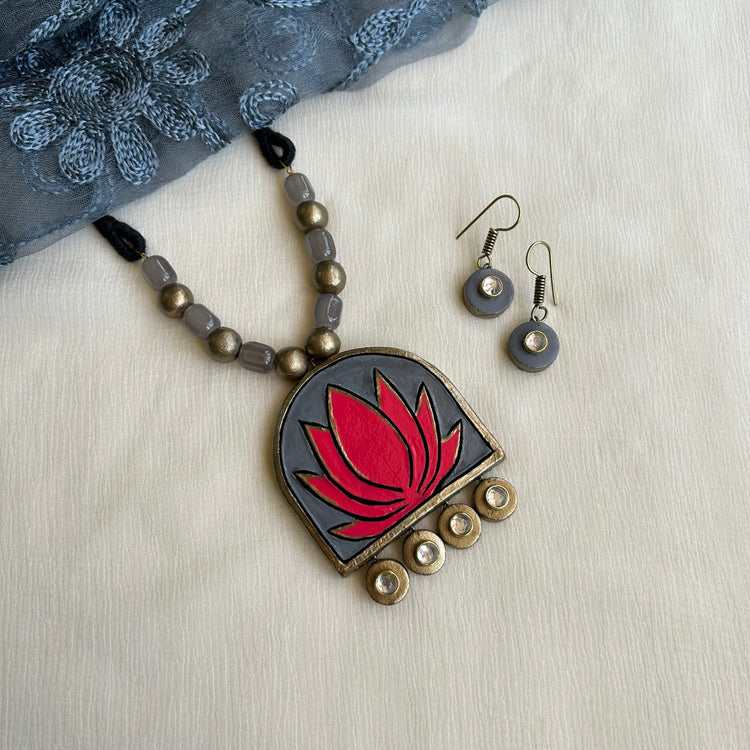 About the Product: Shika's regular wear sets are simple, goes with everything, and can be worn every day to get a sophisticated look. Terracotta pendant with studs in stunning pink, gold and silver shades. The neckwear comes with an adjustable dori for the closure.