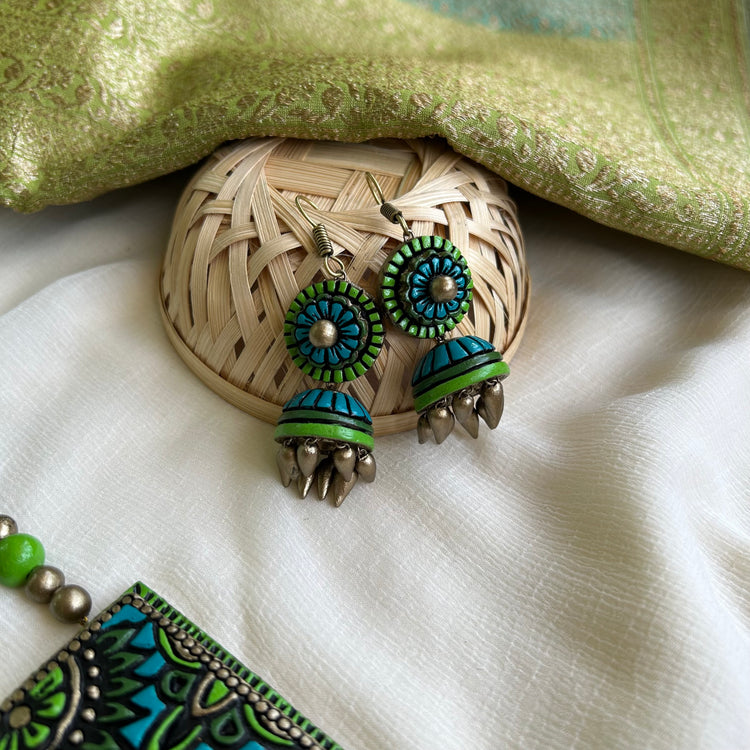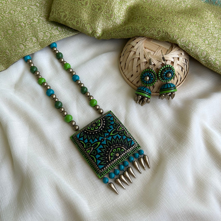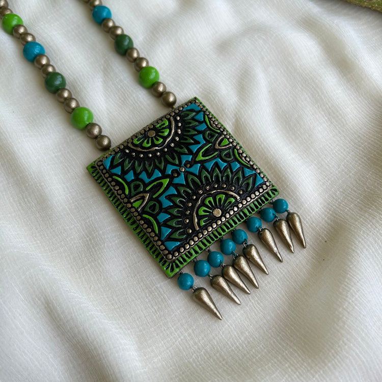 About the Product: This delicate piece of Shika is handcrafted to perfection.Your every moment deserves an elegance and we tune in. Terracotta neckwear with studs stunning teal and green and gold shades The neckwear comes with adjustable dori / chain for the closure.