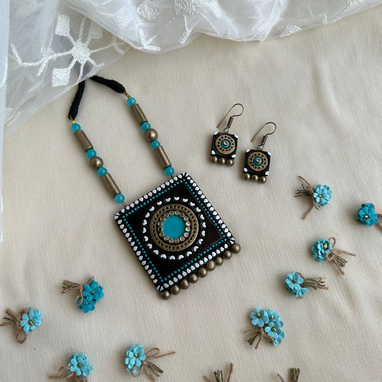 About the Product: Shika's regular wear sets are simple, goes with everything, and can be worn every day to get a sophisticated look. Terracotta pendant with studs in stunning teal, black and gold shades. The neckwear comes with an adjustable dori for the closure.