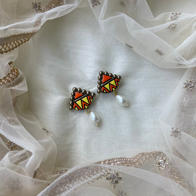 About the Product: Shika's handcrafted danglers are statement earrings that are great for making a powerful impressions. Terracotta 2 step dangling studs in amusing shades.